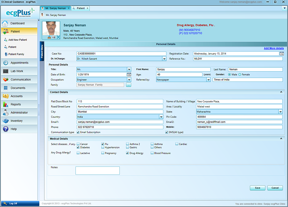All patient data stored digitally on secure servers. Single click retrieval along with customized reports facilitate speedy processing. Additional features viz linking of family members' records